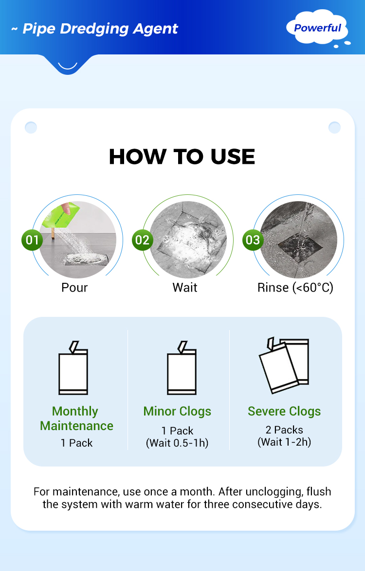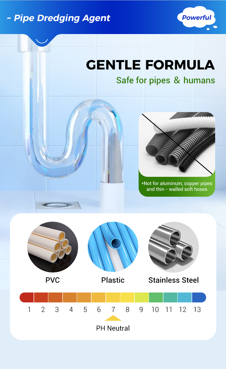 VERSATILE APPLICATION - Suitable for a wide range of pipelines, including those made of PVC, metal, and concrete. Whether it's a drain in your kitchen sink, a stormwater pipe in an industrial facility, or a sewer line in a community, this powder can be used to keep them flowing smoothly without causing any damage to the pipe material.