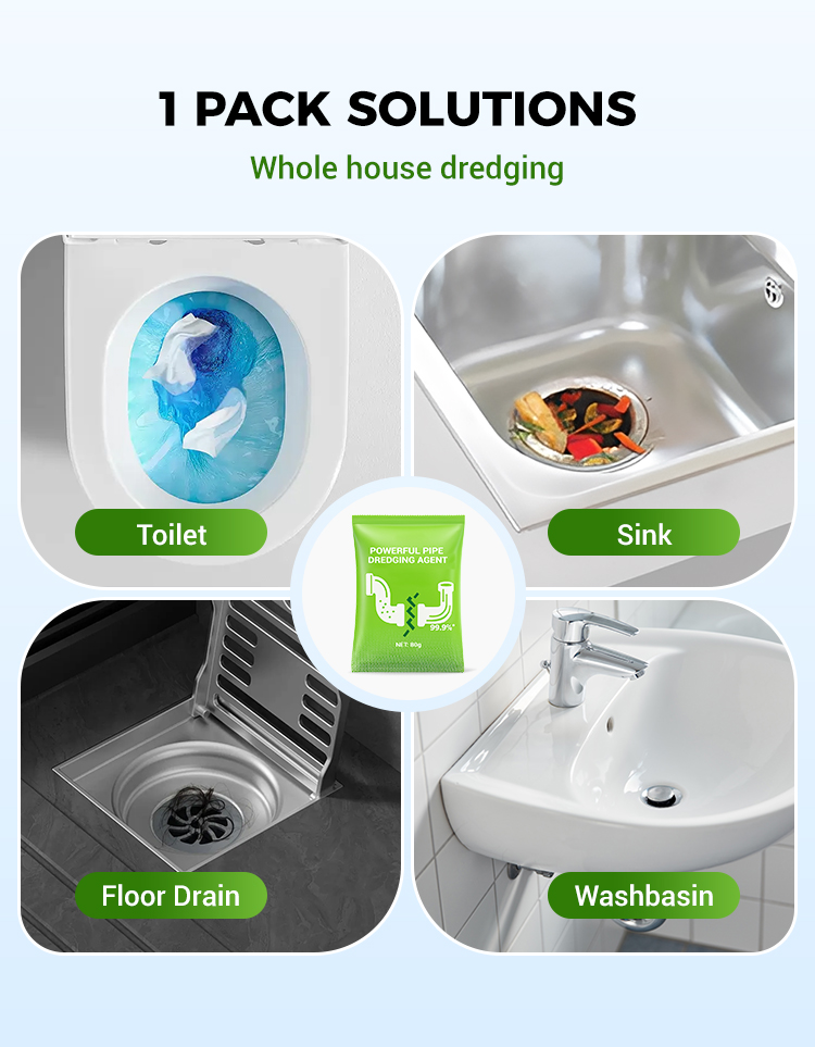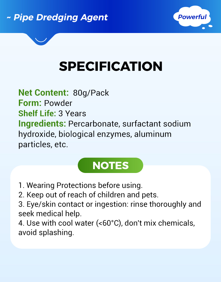 HIGHLY EFFECTIVE DREDGING POWER - This powerful pipeline dredging powder contains specialized active agents that break down tough clogs, sludge, and grease. Its formula is engineered to quickly dissolve even the most stubborn blockages in pipes, ensuring swift and efficient dredging without the need for harsh chemicals or excessive labor.